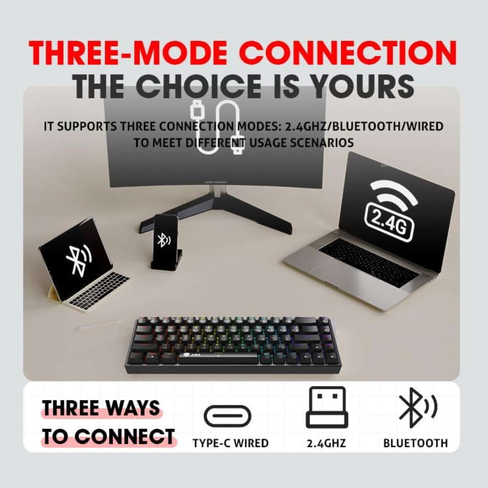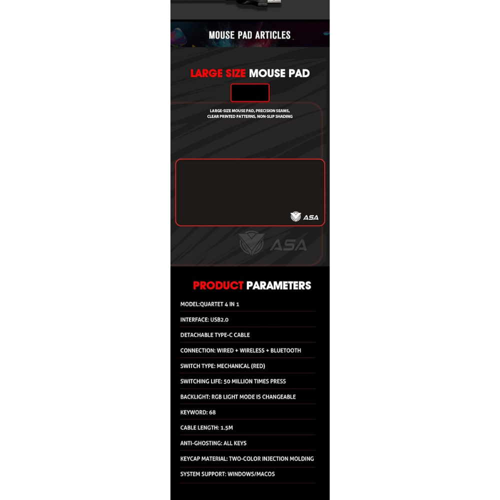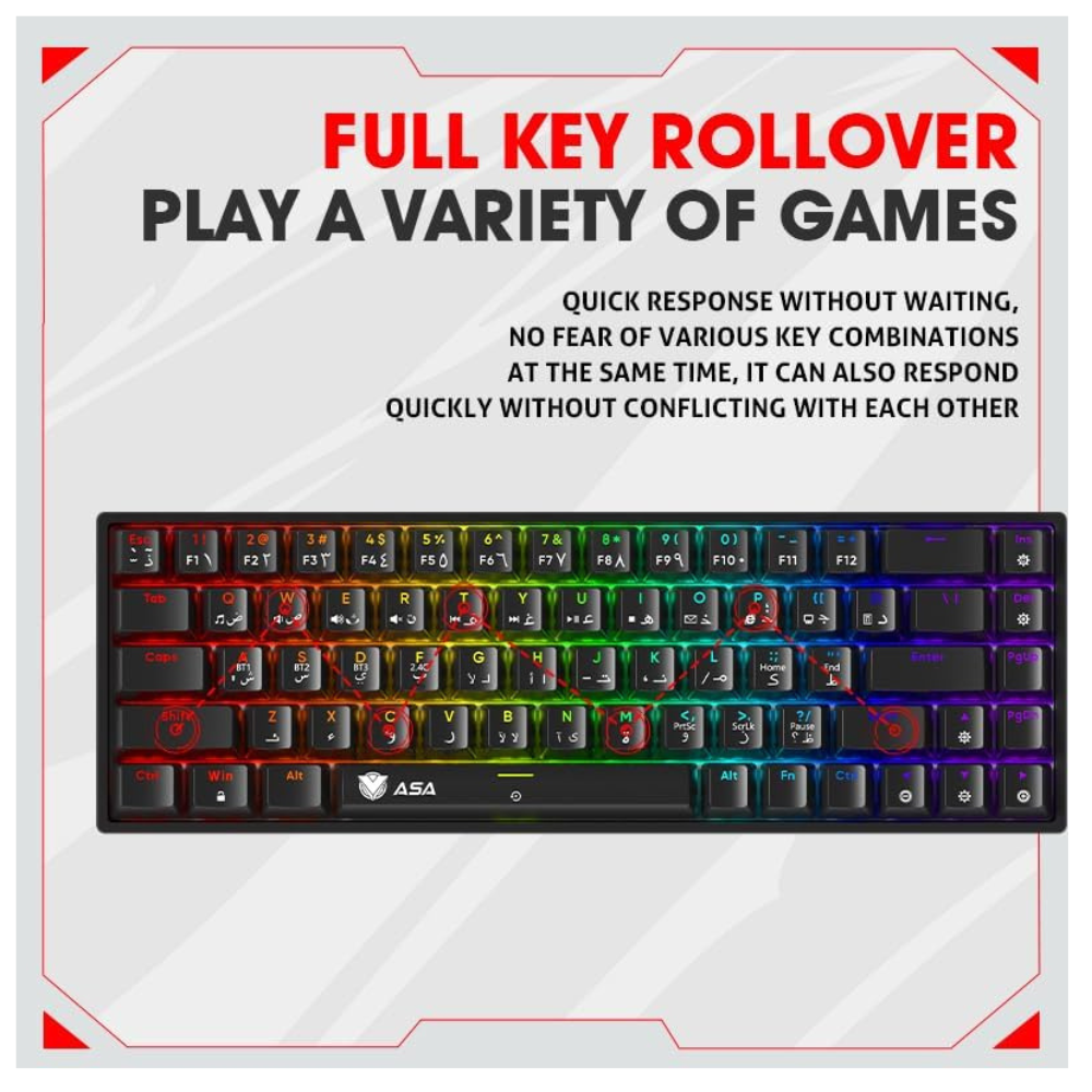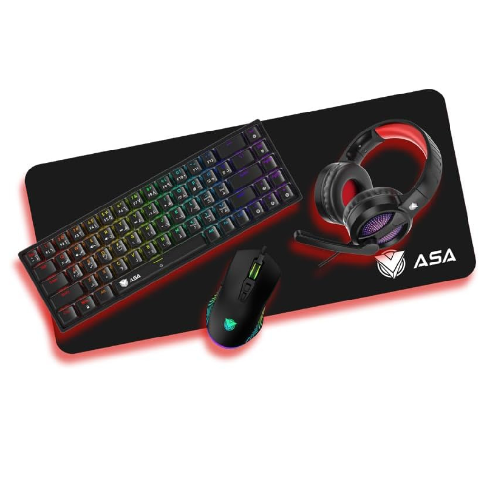 مجموعة كيبورد قيمنق بلوتوث واير لس الألعاب والماوس ولوحة الماوس MM3*30*800 PC كومبو68 مفتاحًا ميكانيكي سويتش احمر مدمج ب 20 تاثيرضاءة خلفية قوس قزح ار جي بي بنظام ويندوز اسود منASA (QUARTET 4IN1)